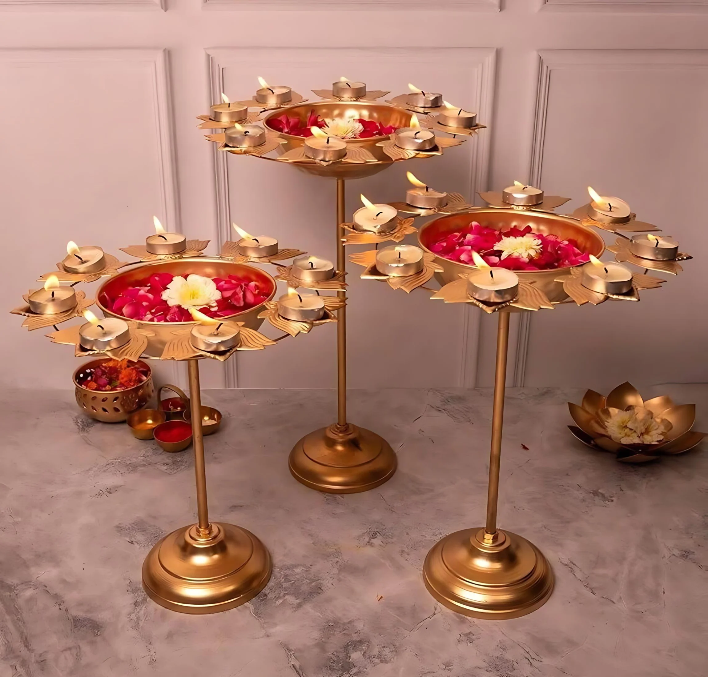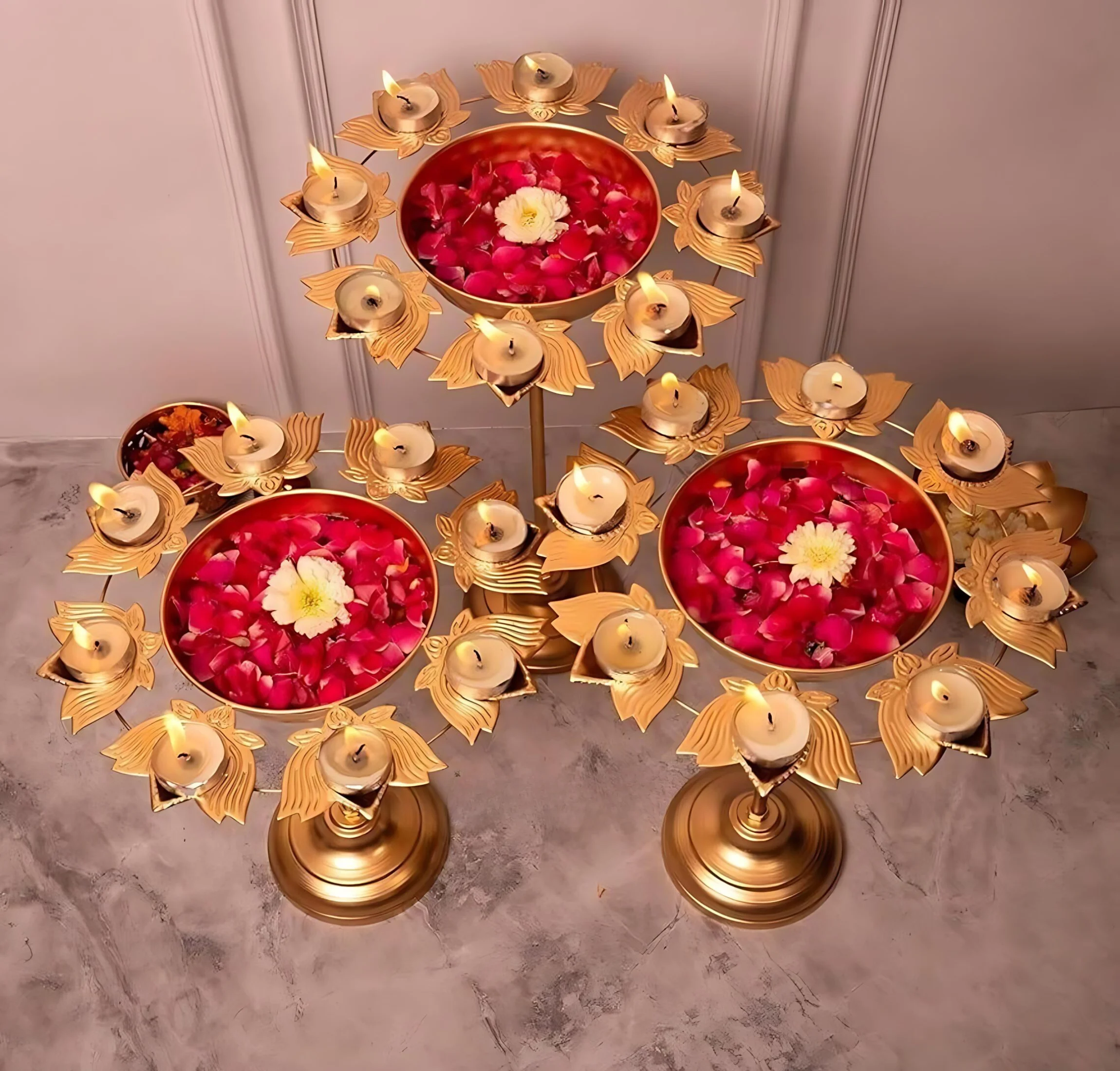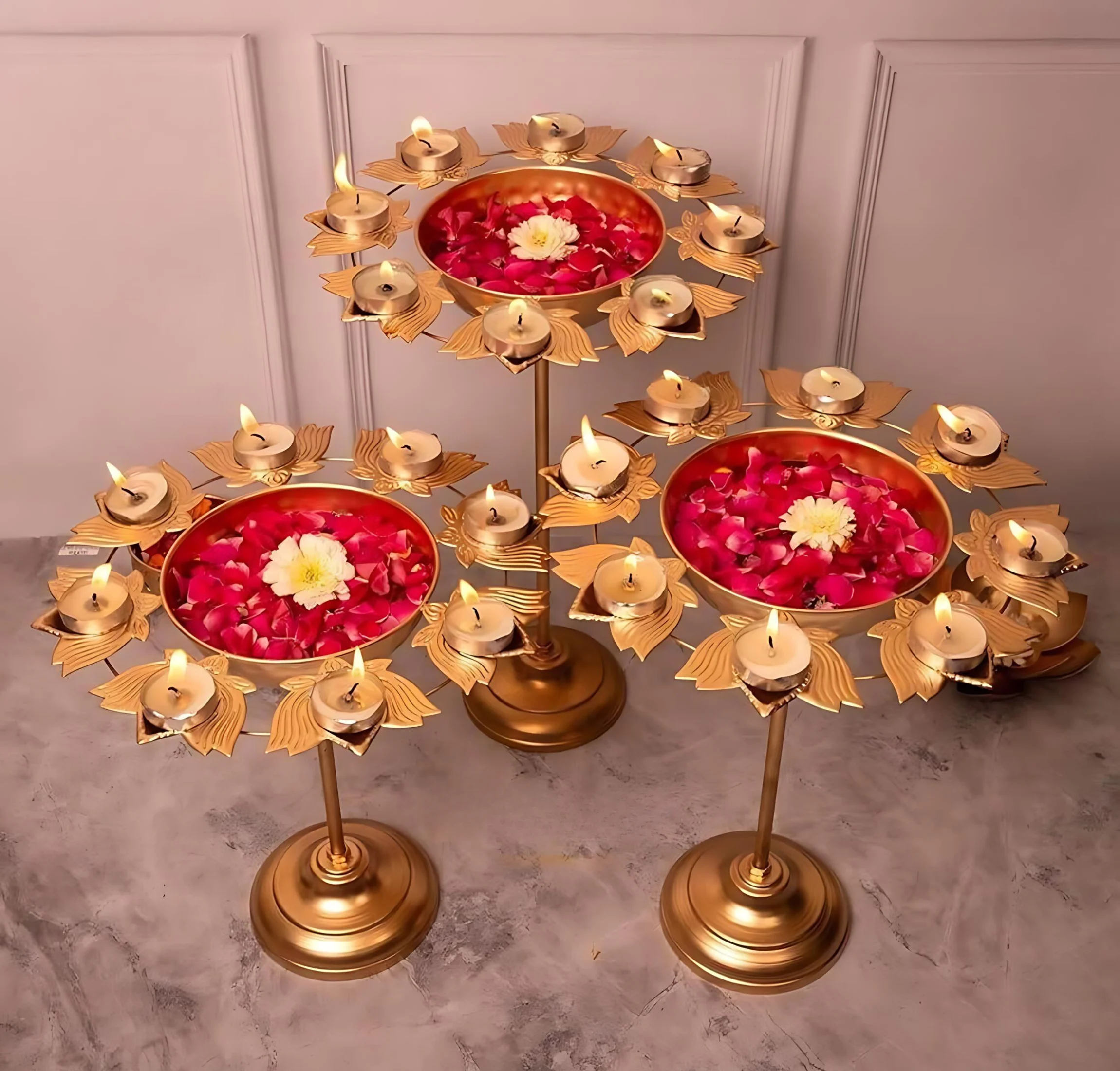 Enhance your Diwali celebrations with this Aesthetic Standing Floral Kamal Diya Urli, designed to bring a touch of elegance and spirituality to your home decor. Crafted from durable iron with a radiant gold finish, this diya stands in sizes of 13, 15, and 17 inches, featuring a spacious 12-inch diameter. Its floral kamal (lotus) design symbolizes purity and beauty, making it a perfect centerpiece for your entryway, living room, or pooja area. Fill it with water, flowers, or floating candles to create a warm, inviting ambiance for festive occasions.