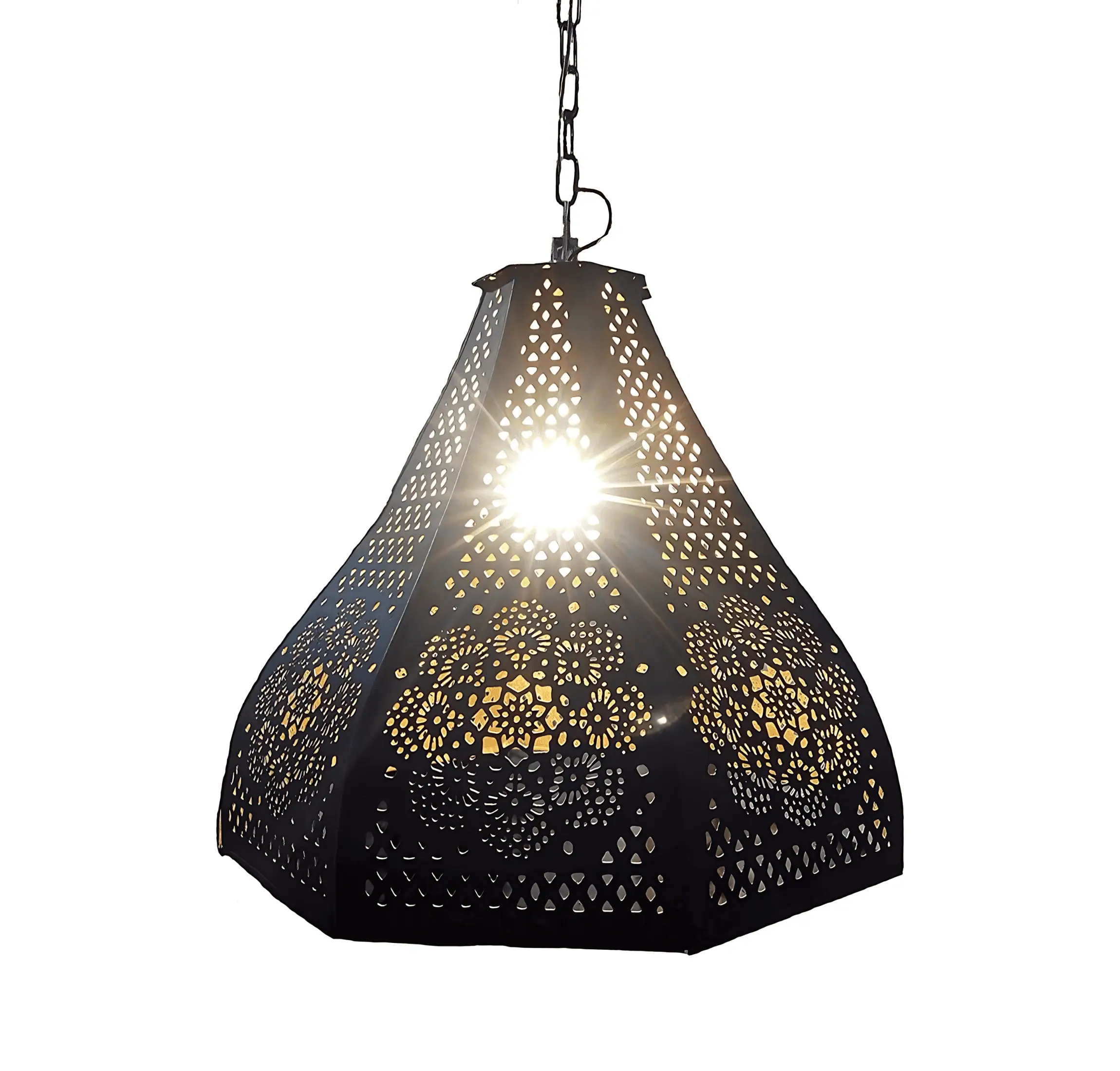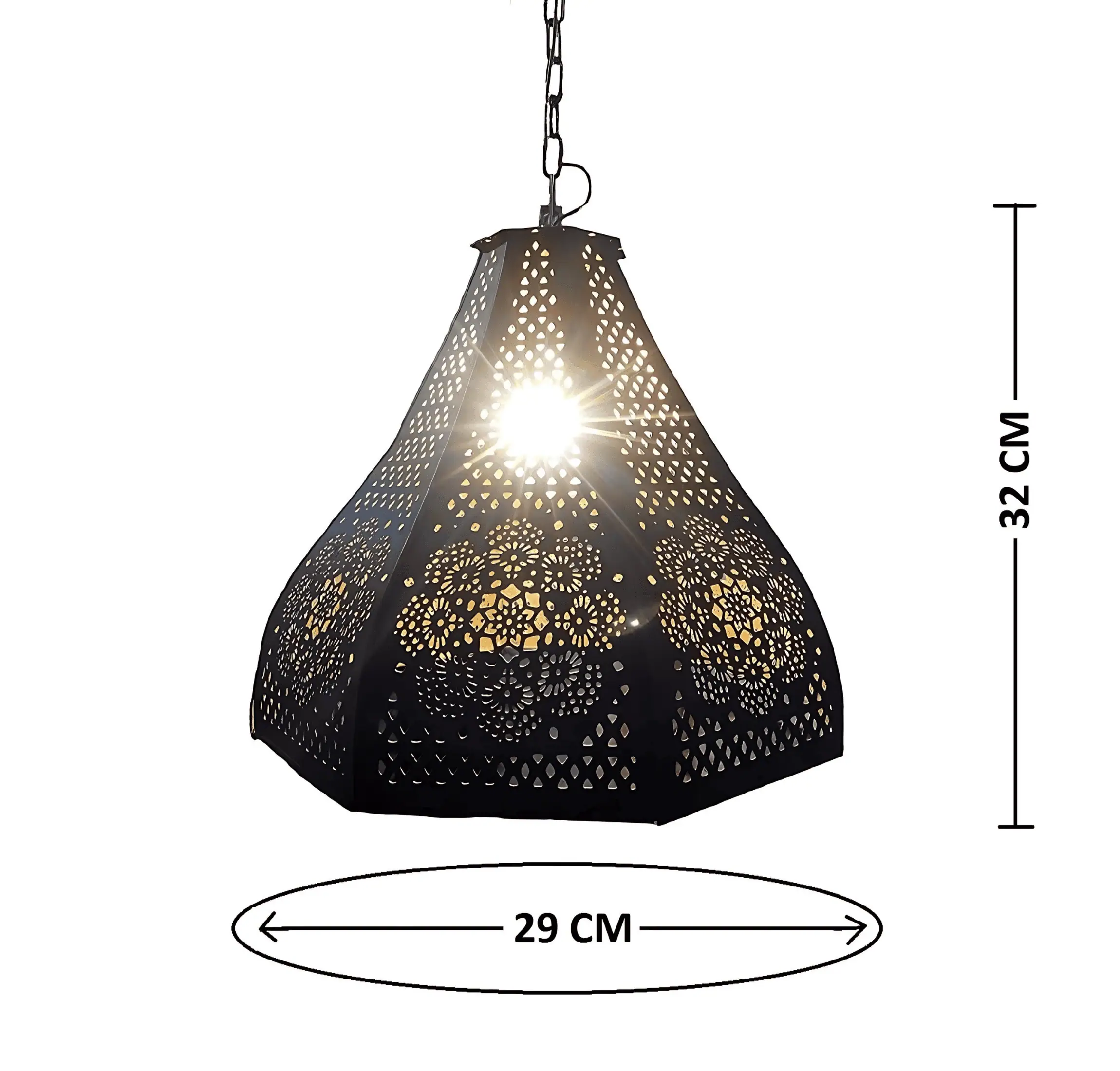 - Design: Features a distinctive Moroccan-inspired design that adds a touch of exotic elegance. The lamp’s exterior is finished in a classic black, while the interior boasts a luxurious gold hue, creating a striking contrast that enriches the overall aesthetic.