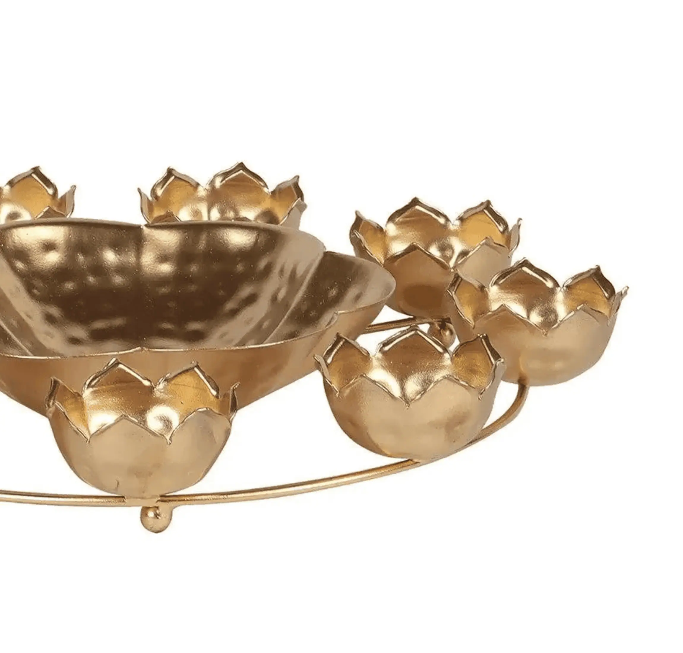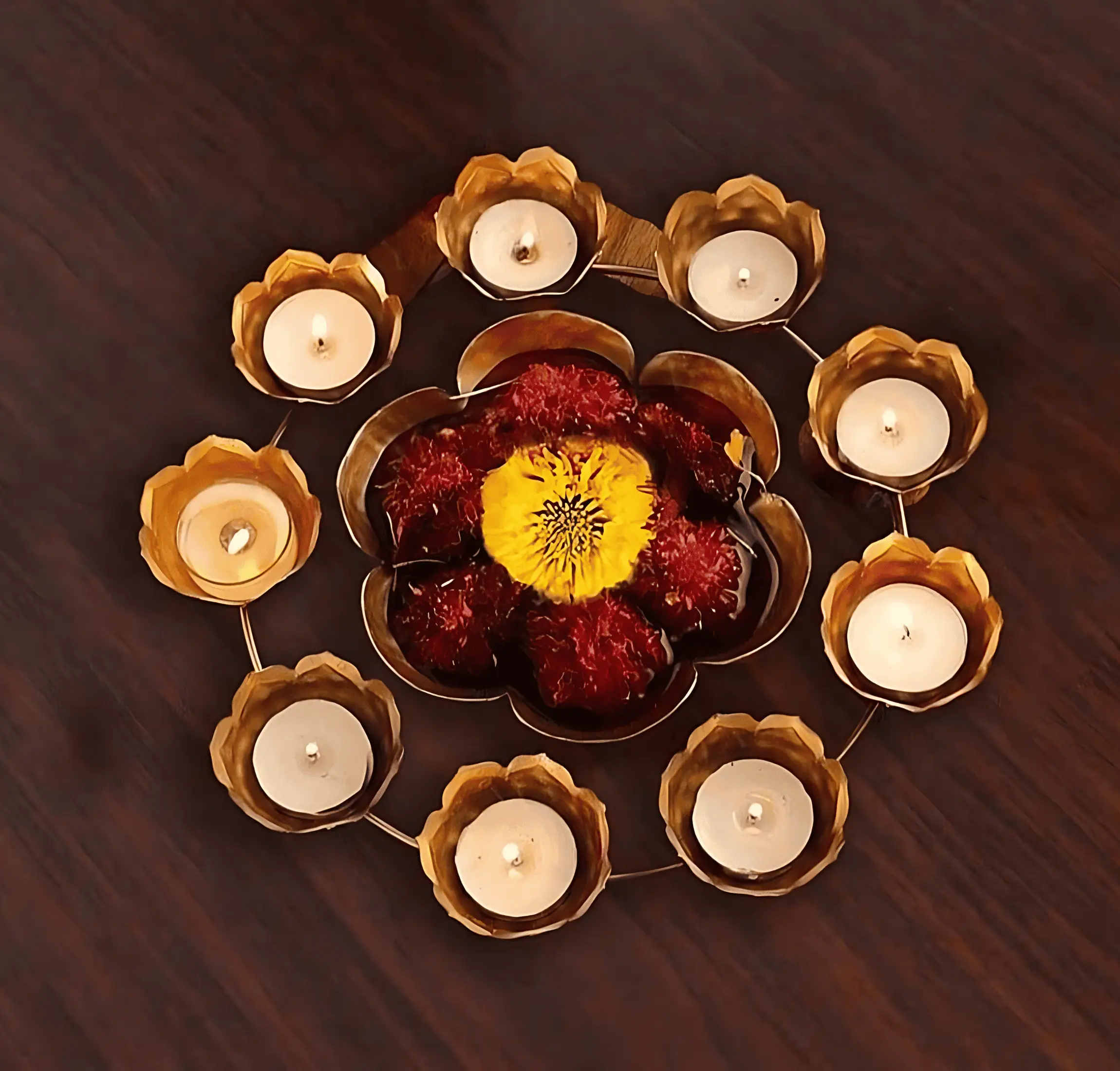 Our Flower Decorative Urli Bowl is meticulously handcrafted in India, showcasing exceptional craftsmanship and quality. This flower-shaped urli is perfect for floating flowers and tea light candles, creating a magical and inviting ambiance in your home. The vibrant, shaded tea-light holders add a burst of color, enhancing the overall appeal and making it a perfect centerpiece for Diwali decoration, home accents, or special occasions.
