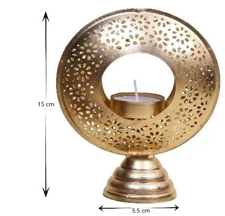 Create a serene and ambient glow in your space with this Circlet Tea Light Candle Holder, designed with intricate cutwork patterns that cast beautiful shadows when illuminated. Crafted from durable iron with a golden finish, this hanging votive makes a perfect decorative piece for balconies, living rooms, pooja corners, patios, or festive displays. Its round silhouette and chain design give it a charming lantern-like appearance, making any setting warm and inviting.