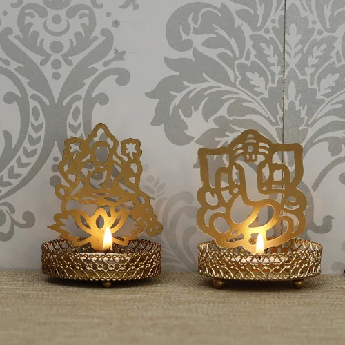 Golden Ganesha & Lakshmi Shadow Tealight Holders Iron Festive Diya Set